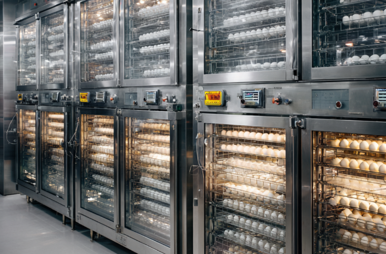 Modern incubators simulate the natural behaviour of a brooding hen. Each phase requires a finely tuned balance between temperature, humidity, and CO₂.
